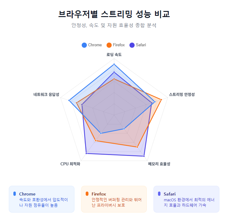 브라우저별 스트리밍 안정성과 속도를 비교 분석한 레이더 차트 형태의 데이터 시각화.
